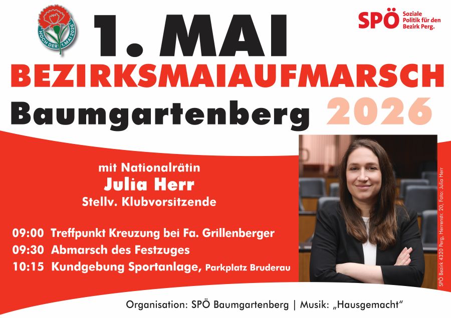 Komm zum 1. Mai nach Baumgartenberg! 9 Uhr Aufstellung bei der Kreuzung Fa. Grillenberger9.30 Abmarsch des Festzuges10.15 Uhr Kundgebung Sportanlage, Parkplatz Bruderau Als Festredner:in erwarten wir Nationalratsabgeordnete Julia HerrMusikalisch sorgt […]